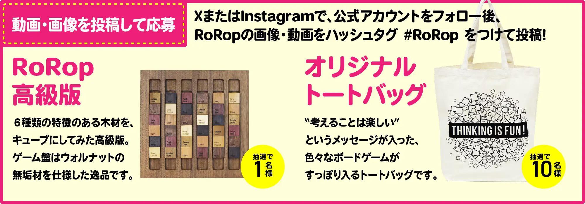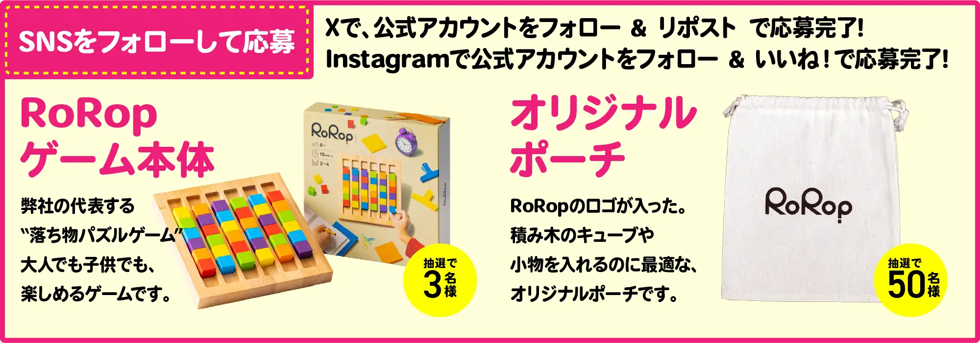 - Wチャンス応募:RoRopで遊んでいる動画や写真を、ハッシュタグ” #RoRop “をつけて投稿で、投稿コース応募完了。